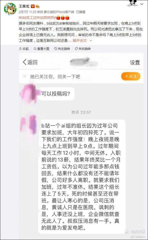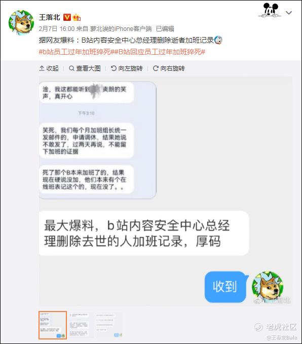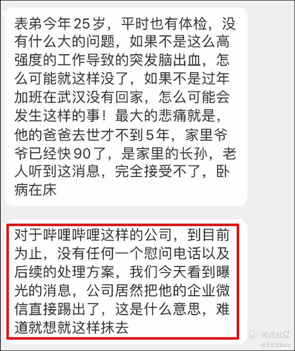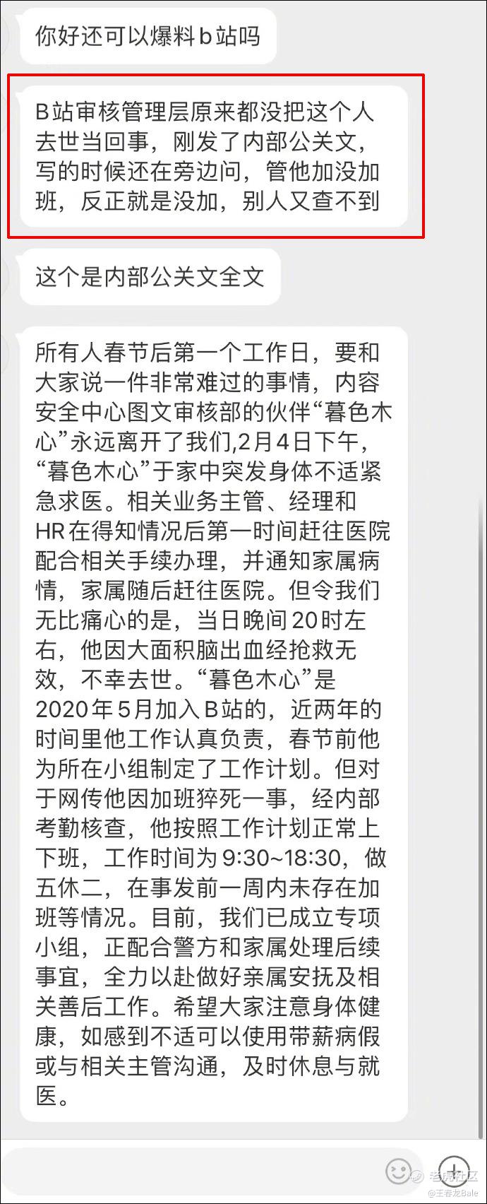 在这三天时间里,B站审核组的管理人员,B站的管理层都在干什么呢?我们不得而知,但他们肯定没有考虑到这位去世员工家人的心情。来自“暮色木心”表姐透露称,到2月7日,“没有任何一个慰问电话以及后续的处理方案”。