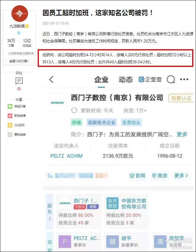 去年7月,南京市江宁区人保局对西门子数控(南京)有限公司进行了一则违规加班处罚,根据处罚信息显示,该公司14人超时加班54-72小时,按每人200元行政处罚;13人超时加班72小时以上,按每人400元行政处罚;还有共49人超时加班36-54小时。但这次处罚也总计为1.29万元。