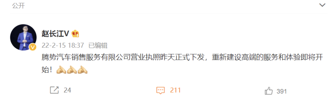 今年情人节,腾势汽车销售服务有限公司成立,由比亚迪全资控股。比亚迪高端品牌筹备办公室主任赵长江第二天在微博发文,腾势汽车销售服务有限公司营业执照正式下发,重新建设高端的服务和体验即将开始。