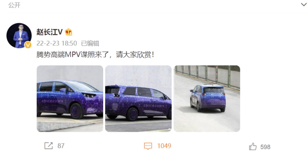 其中,比亚迪高端品牌筹备办公室主任赵长江在微博不遗余力推荐的腾势MPV是重中之重。腾势MPV将在今年的北京车展上发布,采用专属团队设计语言,车型将会是“233”布局的大7座MPV。在动力续航方面,该车会搭载上比亚迪的e平台3.0技术和DM-i 超级混动技术;品牌销售渠道也会采用直营模式。