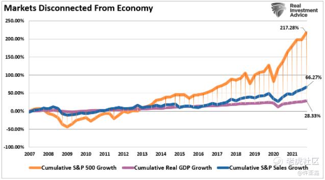 数据显示,到2021年第二季度末,美股已经从2007年的峰值回升了近217%。这相当于7.5倍以上的GDP增长和3.2倍的企业收入增长。