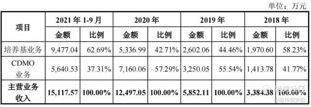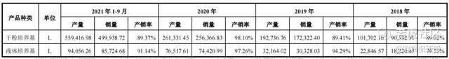 2018-2020年及2021年1-9月,公司培养基产品收入为1970.60万元、2602.06万元、5336.99万元和9477.04万元,2018-2020年复合增长率为64.57%。