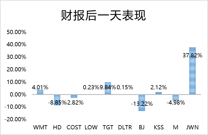 最后,从财报后的表现来看,市值较小的诺德斯特龙在财报后一骑绝尘,大涨38%。业绩相对较好的梅西百货反而下跌了5%,当然这与大盘的强弱以及机构投资者的偏好有关。财报次日表现最差的是BJ批发俱乐部,下跌了13%,一方面是受大盘的影响,另一方面是其业务面临的逆风较多。投资者相对谨慎。