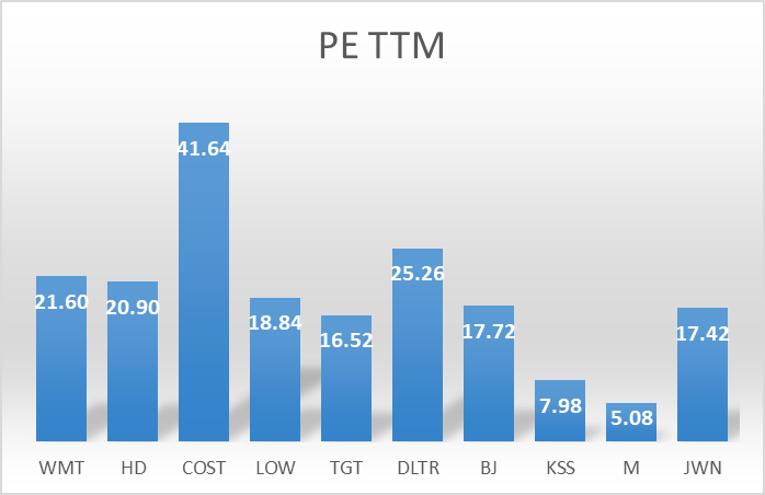 因此,当我们看估值倍数的时候(过去12个月的市盈率),大部分公司都表现较好,其中梅西百货由于本季业绩较好,PE到了5倍左右。而COST因为其近几年来增速较快,市场也给了它较高的估值倍数,市盈率达到近42倍。