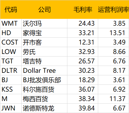 净利率还有梅西百货和家得宝超过10%,相对较低的是低端商品会员店开市客和批发商BJ俱乐部。而沃尔玛由于其更为冗杂的成本结构,净利率也只有3.85%。