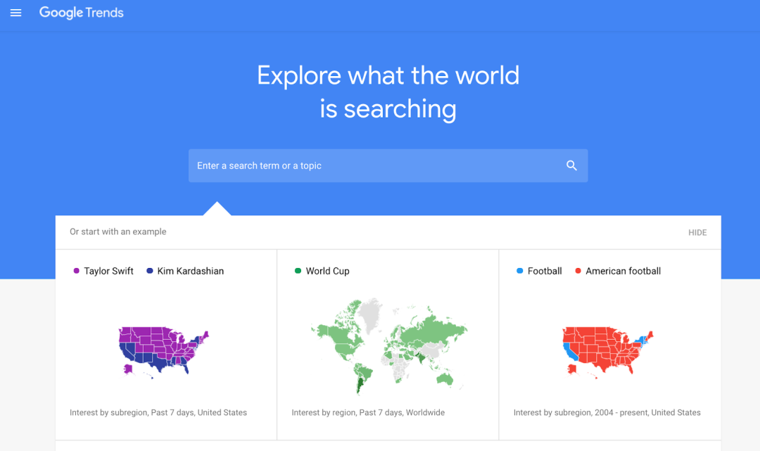 使用 SEO/趋势工具。你可以检查特定关键字的趋势和搜索量,以了解对特定主题的兴趣及其随时间的变化情况。