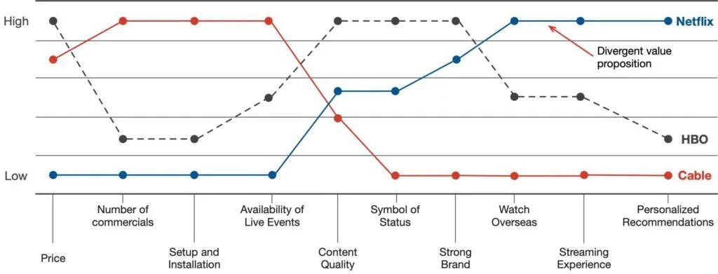 了解竞争格局的另一种方法是使用策略画布。它和特征差距分析类似,但我们不使用矩阵,而是在图表中表示结果。与少数竞争对手或在比较整个市场细分/竞争对手组时效果最佳。
