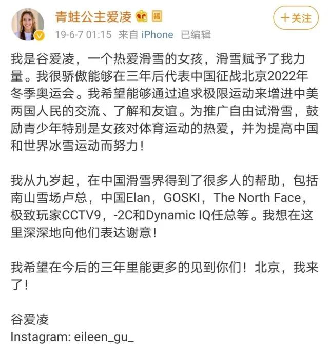 2019年6月7日,16岁的谷爱凌宣布:“我很骄傲可以代表中国征战2022年冬奥会。”很快国际雪联(FIS)官网资料上,谷爱凌的注册国籍从美国变更为中国。