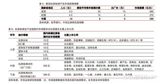 市场空间方面,参考海外地区产品价格,欧洲地区获批品牌较多,单价(出厂价)约为6元,价格已经稳定;美国目前获批企业少,出厂价约为 30 元,中信证券预计欧美抗原检测市场(美国、欧洲)规模约为1300 亿元。而根据广东省收费标准,目前我国院内抗原检测终端收费一人份32元,抗原检测产品进院价17元,假设我国抗原检测产品一人份出厂价5元,平均每人一年检测5次,中信证券预计我国抗原检测市场规模将达到350亿元。