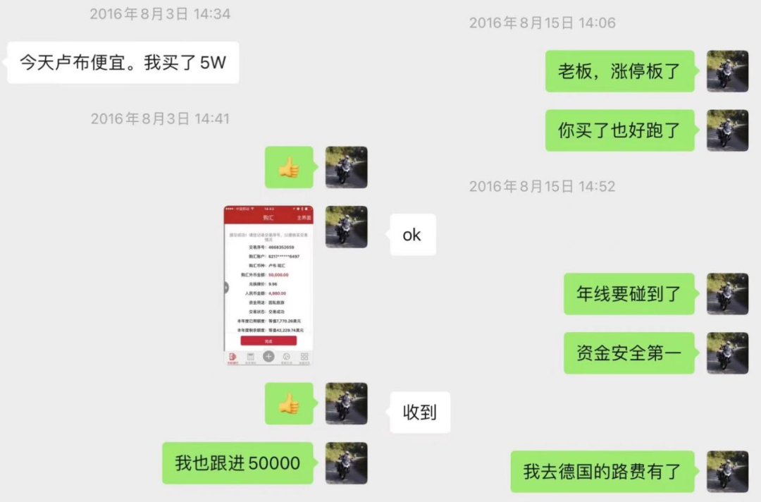第一次回来之后,老郭跟着朋友买了5万卢布外汇,一直在观察汇率走向,8月3日买,8月15日卖,他赚了一张飞去德国的机票。