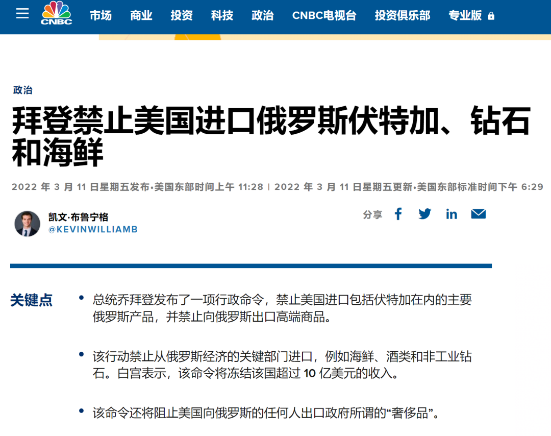 另一边的美国也不傻,制裁俄罗斯,在禁止美国进口的第一批俄罗斯商品中就有伏特加。