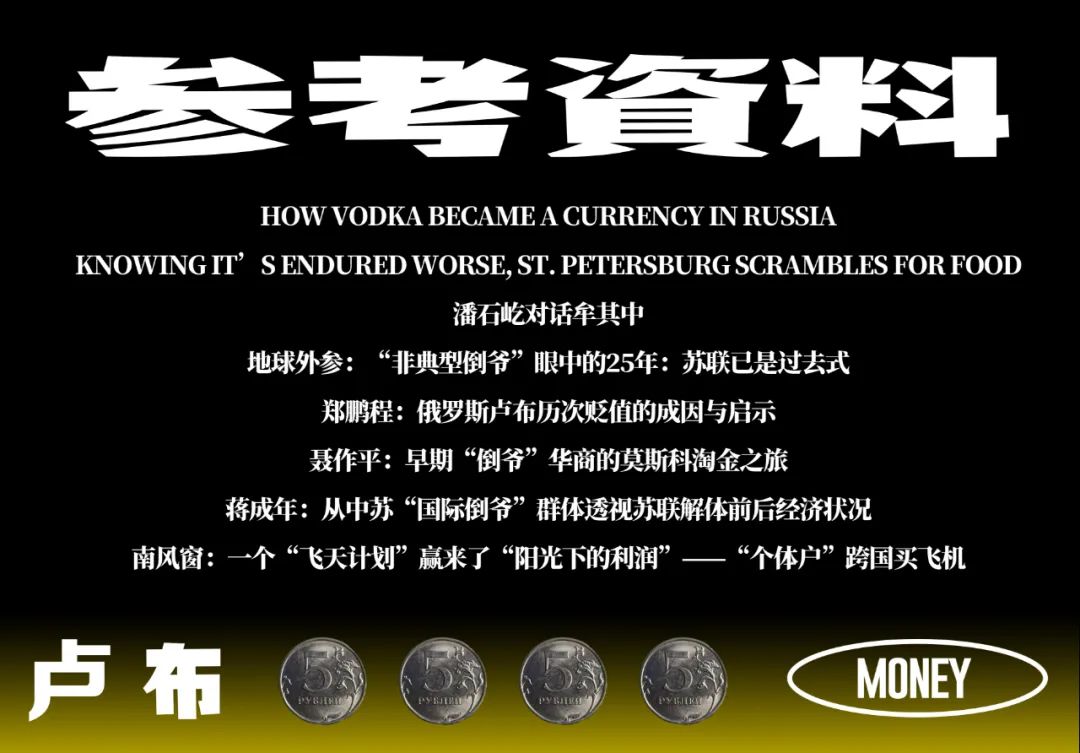 历史成全了伏特加。苏联解体后,经济改革导致了恶性通胀,卢布大贬值,战斗民族发挥爱自嘲的特点:管卢布叫木钱。
