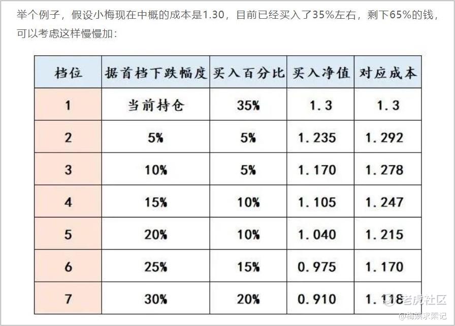 比如,梅姨在《中概互联还能定投吗?》中举例的小梅的加仓纪律,这就是单一标的的“分批加仓,分档加仓”纪律表。