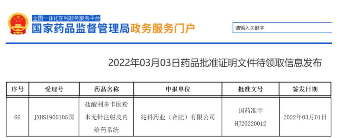 3月3日,中国国家药监局官网公告显示,李氏大药厂的儿童用麻醉产品盐酸利多卡因粉末无针经皮注射给药系统(Zingo)已正式获批,适应症为:3至18岁未成年人的静脉穿刺术或外周静脉插管术的术前局部皮肤麻醉。