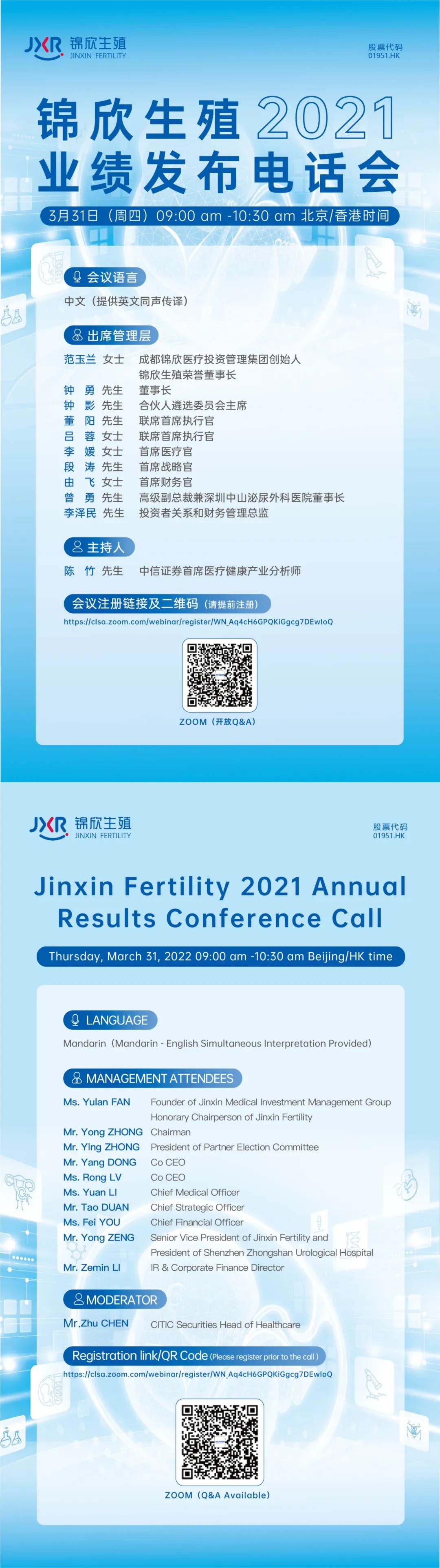 锦欣生殖诚挚邀请您参加3月31日(周四)上午09:00召开的2021年度业绩发布会,届时管理层将为您解读公司2021年度业绩,并分享公司业务更新及发展策略。