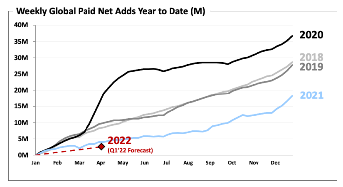最近一个季度(2021Q4)的增长情况也未见好转,Netflix订阅用户净增828万,上年同期净增为850万。同时,Netflix给出的2022Q1净增指引仅为250万,远低于市场预期。
