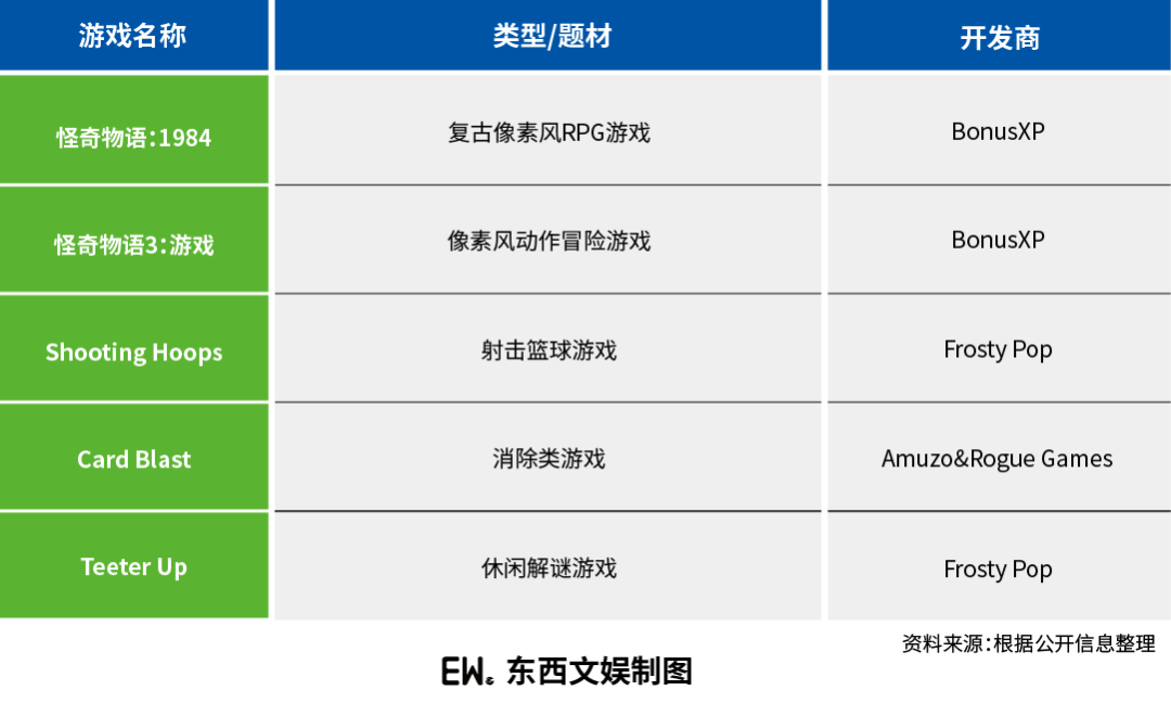 Netflix Games包含5款手游:《怪奇物语:1984》《怪奇物语3:游戏》《Shooting Hoops》《Card Blast》《Teeter Up》,用户可以在移动设备上体验这些游戏。