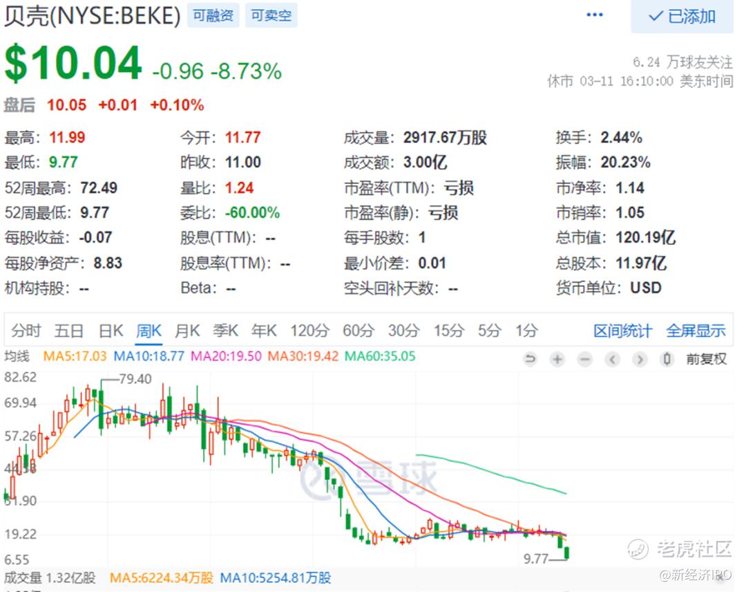 可惜,带着亏损上市的贝壳没有风光多久。2021年5月20日,贝壳创始人兼董事长左晖因病去世。贝壳股价随后开始一路暴跌,自2021年6月迄今,贝壳的股价从50美元暴跌至9.77美元,跌幅超过80%。自最高点计算,贝壳股价跌幅超过92%。