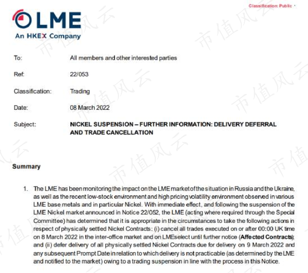 而在一天后的妇女节,LME宣布取消当天的镍期货交易,并推迟原定于3月9日的镍现货交割。