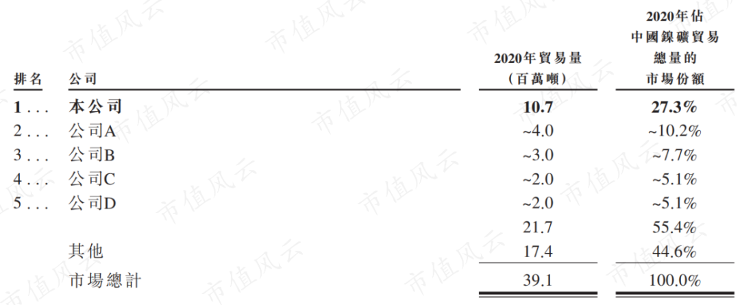2020年,力勤在中国镍矿贸易量中的份额27.3%,排名第一,领先第二名近2倍。