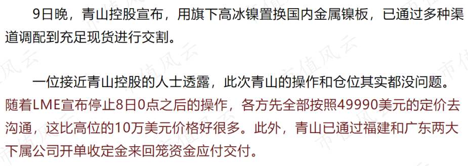 局势瞬间就反转了:3月9日晚,青山控股宣布用旗下高冰镍置换国内金属镍板,已经调配到充足现货进行交割。传言中的逼空告一段落。