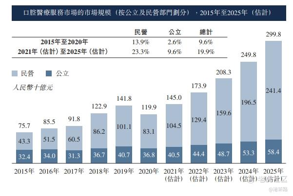 市场方面,近年来,由于公众对口腔健康意识的提高,导致中国对口腔医疗服务的需求不断增长。随着医疗支出的增加及医疗保险服务的改善,中国口腔医疗服务的市场持续扩大。根据弗若斯特沙利文报告,市场规模由2015年的人民币757亿元增加至2020年的人民币1199亿元,年复合增长率为9.6%。尽管受COVID-19的影响2020年市场规模略有下降,但预期市场规模仍将于预测期间内按年复合增长率19.9%继续增长,于2025年年底前达到人民币2998亿元。增长预期将集中于民营口腔医疗机构,其市场规模预期将于2025年年底前达到人民币2414亿元。这是一个高增长的千亿级别的市场。