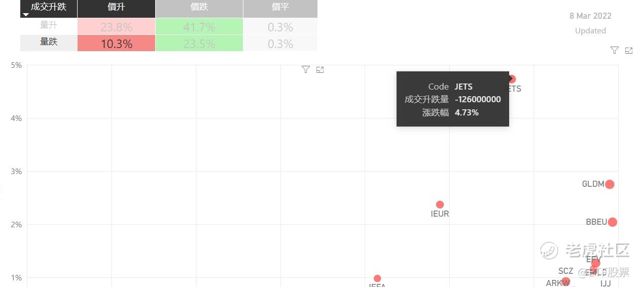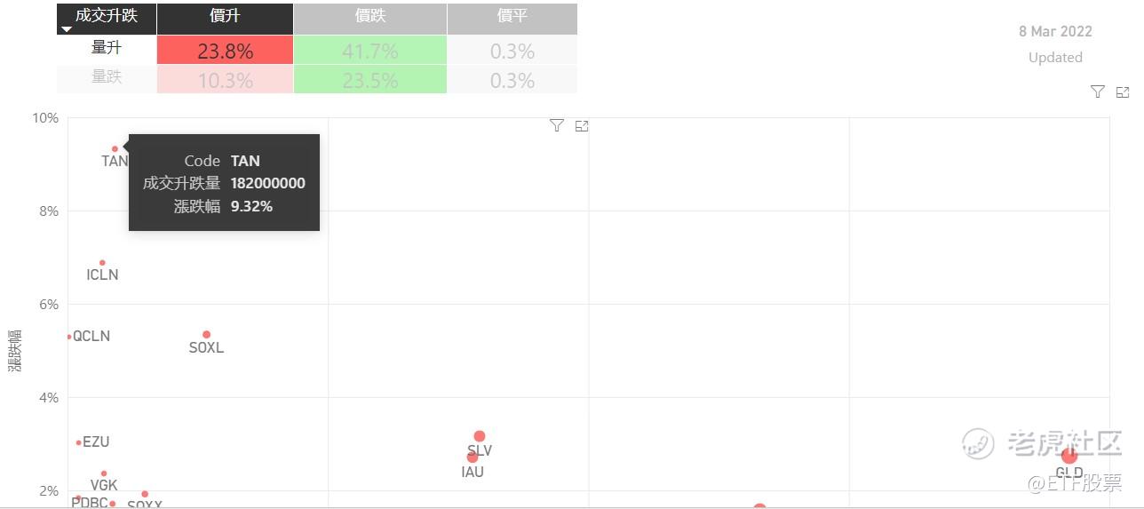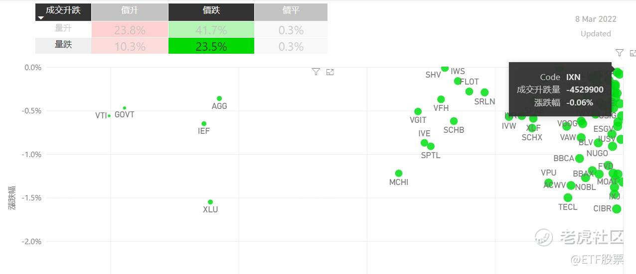 在3月8日的美股主要300只ETF交易品种中,有34%的ETF交易品种的ETF价格上升;尽管只有不到少数ETF价格录得上升,不过仍有10%的ETF产品,虽然价格上升,成交额却下跌。