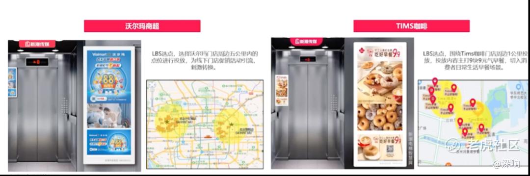此外,如今零售行业也在数字化驱动下走向了门店链接周边社区、针对性输出服务能力的“新零售”升级新阶段。为更好经营门店周边的社区生活圈,沃尔玛商超、TIMS咖啡等品牌都通过新潮传媒的“LBS位置”产品做了选点投放,在叠加限时优惠等促销活动后,即可直接刺激线下转化。