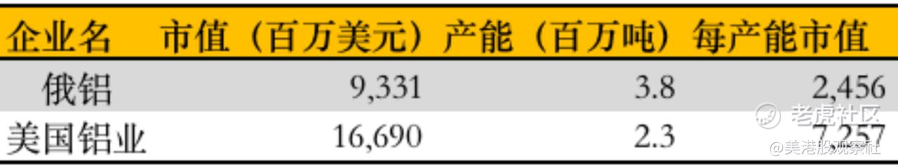 即使最近几天俄铝大幅反弹,可能还有上涨空间。如果回到起跌点还有超过60%的涨幅。对比美国铝业,俄铝年产能380万吨,对应每产能市值2,456。美国铝业年产能230万吨,对应每产能市值7,257。仅仅这样对比,俄铝就还有超过翻倍的空间。