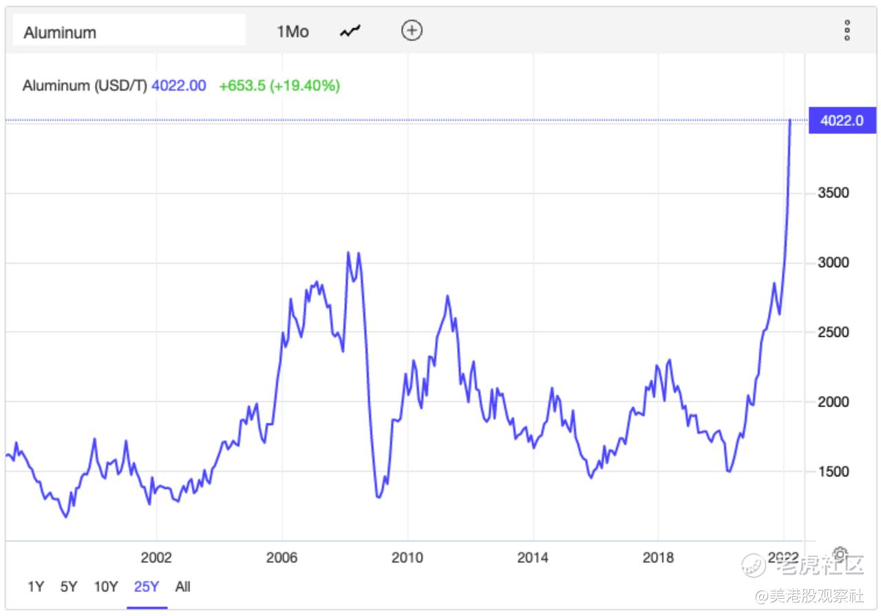 可见,在乌克兰战争时期,想要在西方资本市场抄底俄罗斯资产并不容易。如果未来局势缓和,相关公司从黑屋子里放出来,股价也很可能大幅跳空高开。相比之下,俄铝就成为了抄底俄罗斯的最佳选项。首先俄铝在莫斯科和香港上市,不会被西方资本市场停止交易。再者,铝价格已经创出25年以来的新高,每吨超过4000美元。