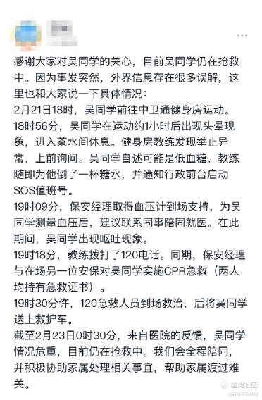 但2月23日早间,字节跳动却在内网发布辟谣,称该员工在健身房运动时举止异常,由教练拨打120叫来急救人员到场救治后送上救护车,目前仍在医院抢救中。