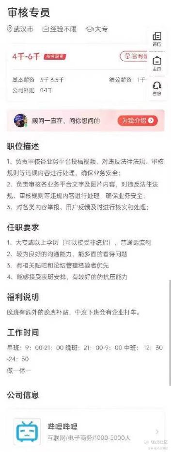 但根据B站此前的招聘信息,武汉地区的审核专员需要三班倒。其中早班是9点到晚上21点,12小时,晚班则是晚上九点到早上九点,12小时。
