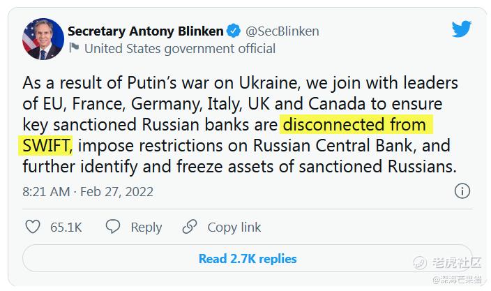 1月26日美国与欧盟发布联合声明宣布禁止部分俄罗斯银行使用SWIFT(环球同业银行金融电讯协会)系统,以实现对俄罗斯的金融制裁。
