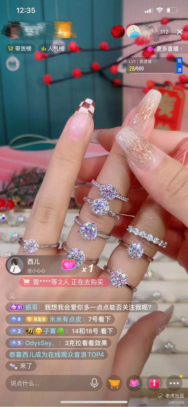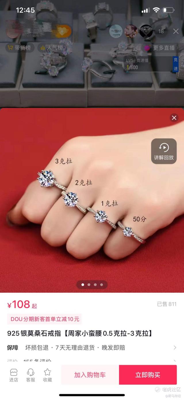 更让人觉得“钻石自由已来”的,是“莫桑钻”。抖音上的“董先生珠宝”,GMV在珠宝频道中一向名列前茅。其一度以“莫桑钻批发”闻名,所售卖的莫桑钻戒,甚至可以便宜到199元。而另外一些河南钻石商家,为了吸引粉丝,在直播间里做进店加关注,送30-50分不等的莫桑钻戒指、或者买戒指送碎钻排戒的活动。