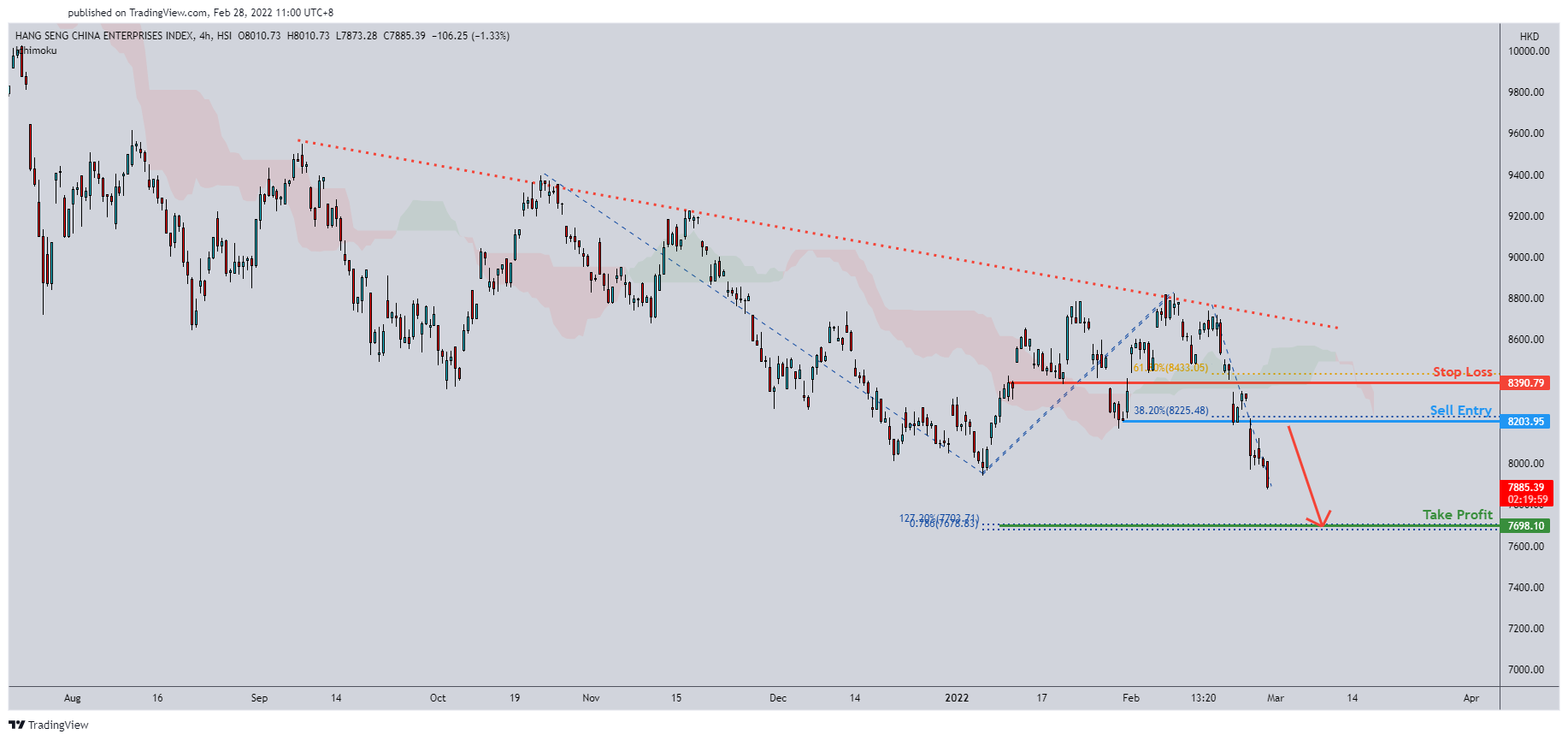 I'm seeing prices abiding to my descending trendline and going on a strong bearish momentum. Looking to get in at the sell entry @ 8203.95 in line with 38.2% Fibonacci retracement and also horizontal overlap. Probably going to short to 7698.10 in line with 78.6% Fibonacci retracement and 127.2% Fibonacci extension have my stop loss at 8390.79 in line with 61.8% Fibonacci retracement.