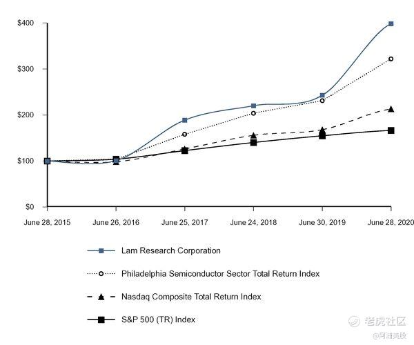 下图将Lam Research Corporation的五年期普通股股东总收益与费城半导体行业总收益指数,纳斯达克综合总收益指数以及标准普尔(“ S&P”)500( TR)索引。该图跟踪了截至2020年6月28日的五年中,对林研究公司的普通股和每个指数进行的100美元投资(以及所有股息的再投资)的表现。