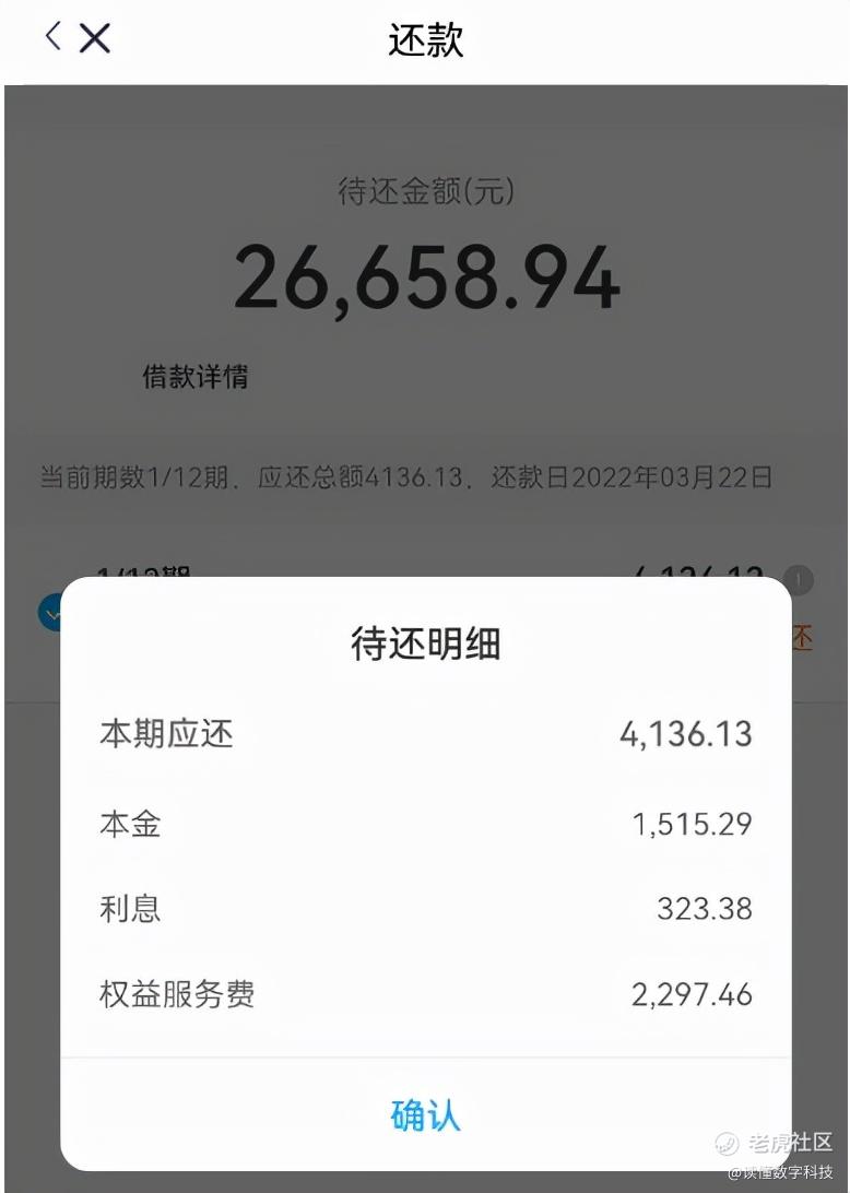 通过该用户的截图可以看出,若以利息论,该借款月利率仅为1.62%,折算年利率为19.5%,但该借款还要收取2297.46元/月的权益服务费,通过其他同类投诉可知:恒易贷的权益服务费在前两期收取,即总计约4600元,比12个月的总利息还高,一年下来借款成本近7000元。