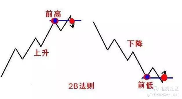 2、接下来,由于上升趋势不再创新高,而下降趋势也不再创新低。原有的趋势被打破,反抽之后也无法回到原有的趋势当中。原本的支撑线变成了压力线,而原本的压力线反过来变为了支撑线。趋势开始反转了。这里我们需要注意,有的时候价格会出现短暂的假突破(新高或者新低),但很快又回到前高以下或前低以上,因此还可以和接下来我要讲的2B法则相结合。