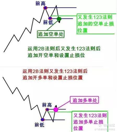如果2B法则之后又发生符合123法则的情况,结合123的操作方法加仓补仓,原先的止盈价和加仓后的止损价共同放在前低点稍上方(或前高点稍下方)。