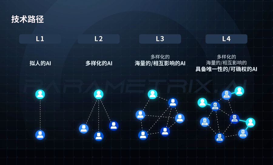 作为技术驱动的公司,在确立大方向和以AI Bot为核心的公司战略之后,超参数提出了包含L1到L4四个阶段的研发路径,即从具有简单拟人功能的AI Bot个体,到最终形成一个以AI Bot为主社会生态。