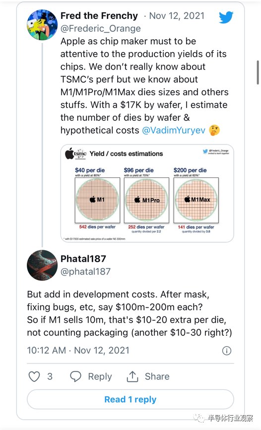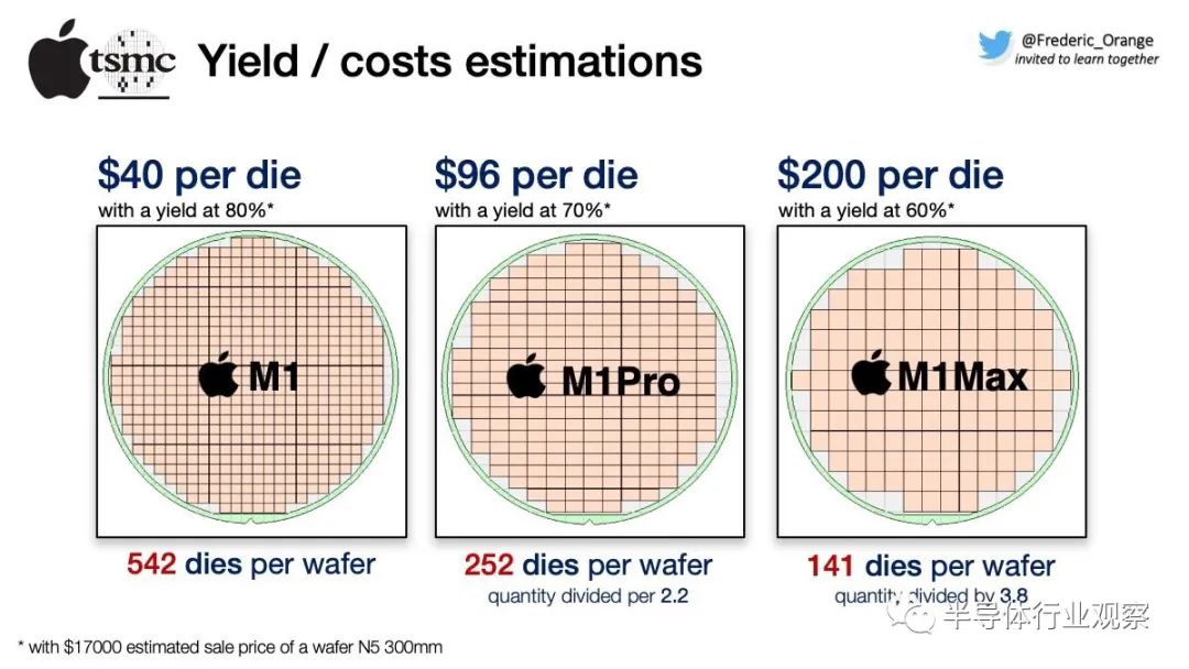 我们可以看到 ,如果M1 芯片每个die的良率为80%,那么其价值为$40 , 良率为70%的M1 Pro 价值为$96,良率为60%的 M1 Max 在每个die价值为$200.这些芯片是由TSMC的5 nm工艺制造,应用在旧型号的MacBook 上使用了一个10 nm制程的英特尔芯片。