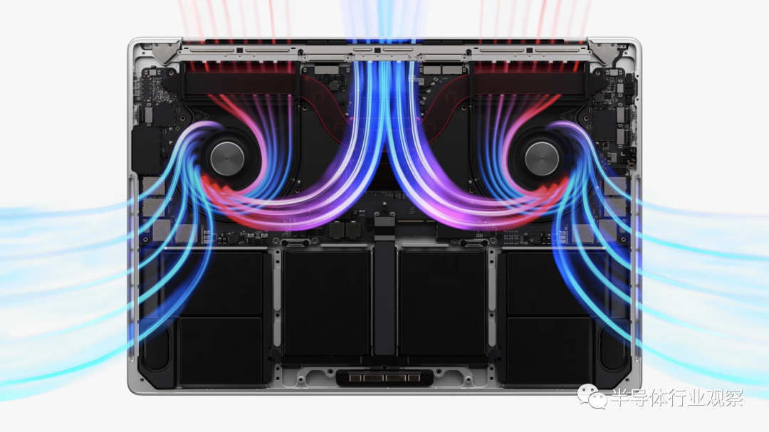 冷却是任何计算机系统中非常重要的一部分。它的设置是为了快速管理芯片和系统的重要组件。苹果没有把风扇放在疯狂薄的 MacBook Air中 ,但确实把两个放在先进的 Pro 级别的 MacBook Pro 中.再者,苹果和其他所有电脑厂商一样,把相对较大的两个热管、进气风扇和导热胶放在芯片上。
