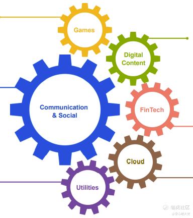 在腾讯的业务轮盘中,无疑社交是最核心的腹地。从2019年开始投资业务变成腾讯最大的业务,并不在上表轮盘中。其他小轮盘也发生了变化,腾讯将金融服务与企业服务一起披露,将游戏拆分为国内与国际业务。我们在下面将详细说说。