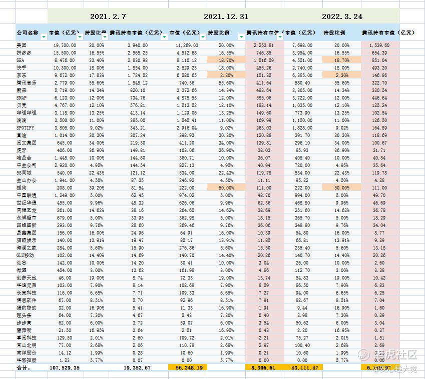 截止去年8月18日的投资公允价值1.30万亿,去年年初2月7日持仓总市值为1.94万亿。截止2021年12月31日,腾讯持仓公司市值1.49万亿,大幅超越其自己披露的9828亿;同时由于年初到现在的股价大跌,我算了下截止目前的持仓市值为6150亿元。今年年初至今又亏损了3000多亿,惊人。