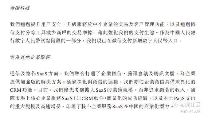金融服务更多是微信支付,而企业服务主要包含云服务等,前者toC,后者toB,有着比较大区分度。