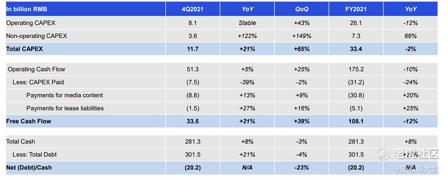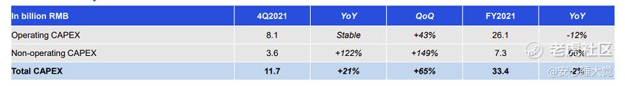 腾讯2021年全年资本性支出为334亿,同比下降2%,稍有降低。其中经营性相关支出是261亿,非经营性资本支出73亿,同比增加66%。
