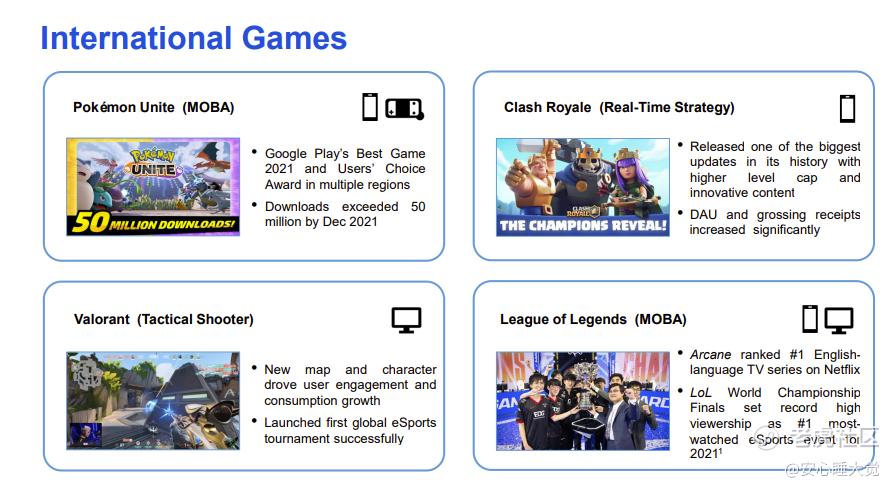 国际手游中,活跃用户前十,有五款是腾讯的。如上图所示,皇室战争、LOL手游、皮卡丘手游、Valorant射击游戏都有不错的表现。
