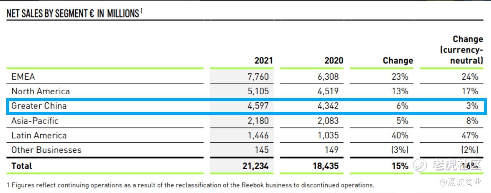 3月9日,阿迪达斯公布业绩,2021年第四季度,大中华区市场销售额同比下降了24%,拖累当季全球总销售额同比小幅下降至51.4亿欧元。大中华区市场占比约为1/5。2021年全年,阿迪达斯大中华区销售额从2020年的43.42亿欧元增长6%至45.97亿欧元(322亿元),如果剔除汇率因素影响,这部分业务的实际增长率是3%。2021年第一季度阿迪在华开局不错,让全年销售增长勉强为正。