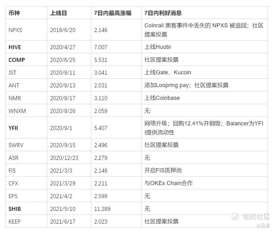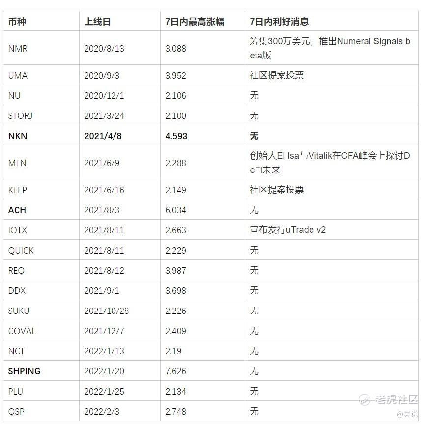 另外,对于涨幅过大(超过 1 倍)的币种我们会通过表格进行列举,并逐个搜寻同时间段内的利好消息,力求排除干扰事件。需要解释一下,我们选取的上新币种均以公告和新闻为准,超出此范围的币种未搜集。