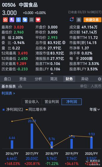 中国食品(00506)的净利润从2018年暴跌7成后,2019,2020均在增长,平均增速29%,2021年上半年又增长了33%至7.46亿。营收增长曲线很好,不知道2018年净利为什么跌那么多,可能是2017年透支了未来的增长。流动比率0.77,速动比率0.57,现金流不怎么好。